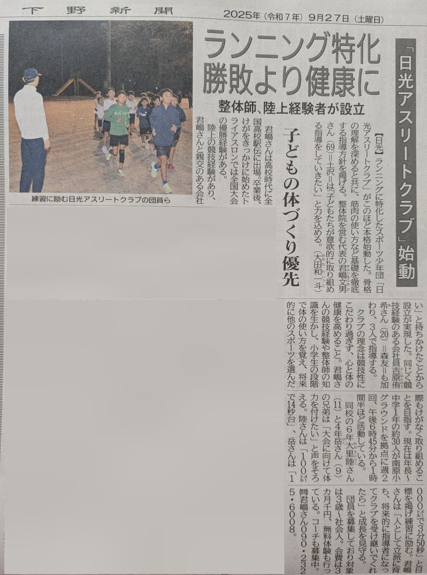 【日光】ランニングに特化したスポーツ少年団「日光アスリートクラブ」がこのほど本格始動した。骨格の理解を深めると共に、筋肉の使い方など基礎を徹底する指導方針を掲げる。整体院を営む代表の君嶋文男さん(66)=土沢=は「子どもたちが意欲的に取り組める指導をしていきたい」と力を込める。(大田和一斗)